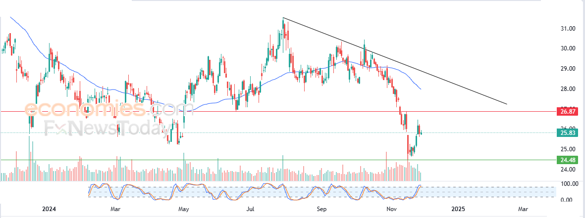لذلك فتوقعاتنا تشير إلى انخفاض سعر السهم خلال تداولاته القادمة، طيلة استقراره دون مستوى المقاومة 26.90$، ليستهدف من جديد مستوى الدعم 24.50$.