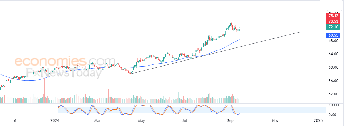 لذلك فتوقعاتنا تشير إلى المزيد من الصعود لسعر السهم خلال تداولاته القادمة، طيلة ثبات مستوى الدعم 69.55$، ليستهدف مستوى المقاومة المهم والقريب 73.50$ استعداداً لمهاجمته، وفي حالة اختراق تلك المقاومة سيستهدف السهم بعدها مباشرة أولى مستويات المقاومة عند سعر 75.40$.