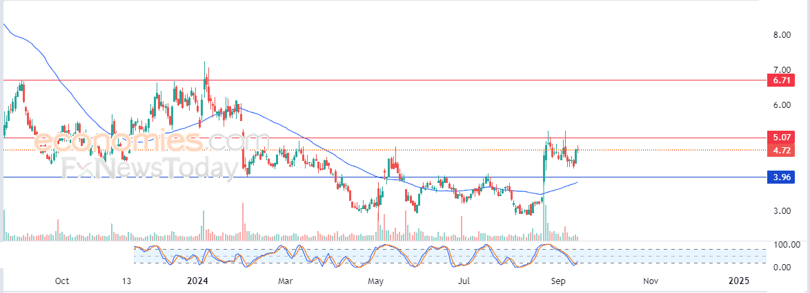 لهذا تشير توقعاتنا إلى ارتفاع سعر السهم خلال تداولاته القادمة، خاصة في حالة اختراقه لمستوى المقاومة 5.00$، ليستهدف بعدها مستوى المقاومة المحوري 6.70$.