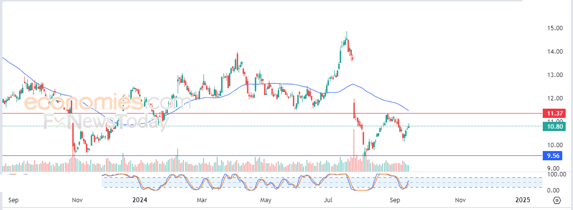 لهذا تشير توقعاتنا إلى ترجيح سيناريو عودة هبوط سعر السهم خلال تداولاته القادمة، طيلة ثبات مستوى المقاومة 11.40$، ليستهدف مستوى الدعم المحوري 9.60$.