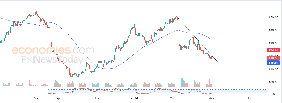 لذلك فتوقعاتنا ترجح عودة هبوط سعر السهم خلال تداولاته القادمة، طيلة ثبات المقاومة 124.70$، ليستهدف أولى مستويات الدعم عند سعر 115.90$.