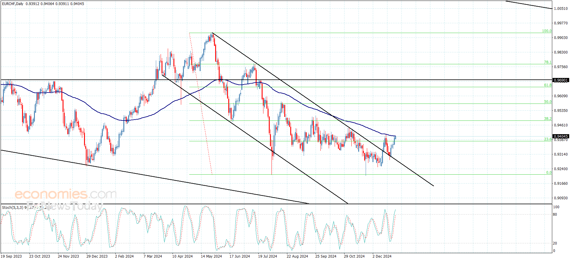 استمرار تجميع السعر للعزم الإيجابي سيزيد من فرص تجاوزه للعائق الحالي ليمكنه ذلك من استهداف العديد من المحطات الإيجابية الإضافية باندفاعه نحو 0.9445 وصولا لمستوى تصحيح 38.2% فيبوناتشي المتمركز عند 0.9485.
