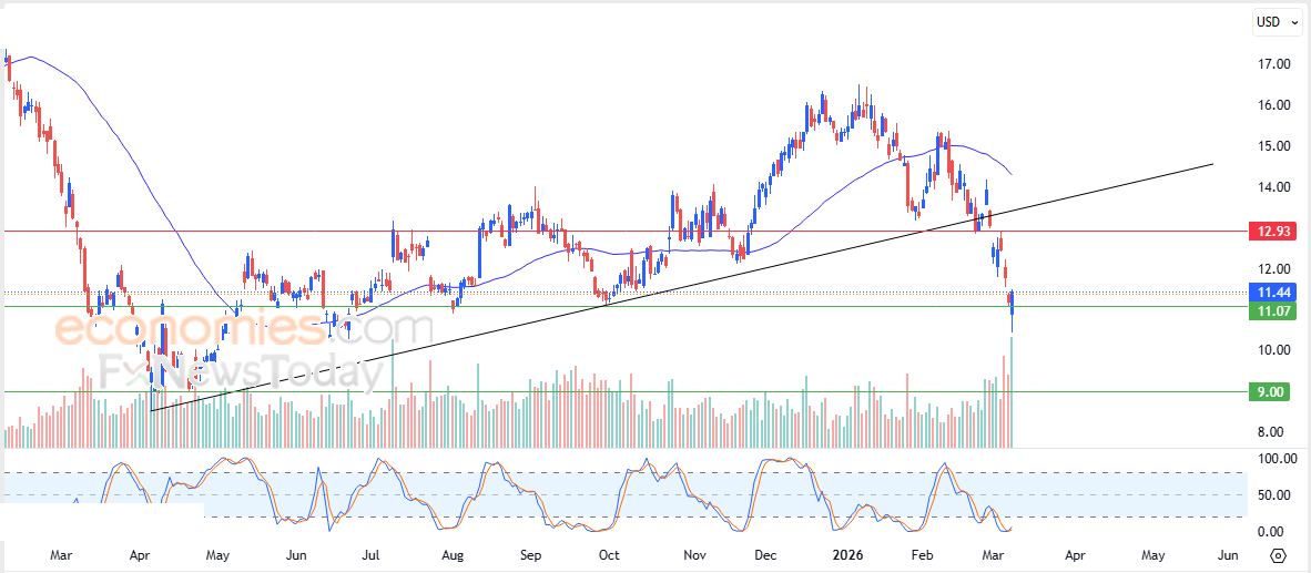 لهذا فتوقعاتنا تشير إلى انخفاض سعر السهم خلال تداولاته القادمة، خاصة في حالة كسره للدعم المذكور 11.05$، ليستهدف بعدها مستوى الدعم المحوري 9.00$.