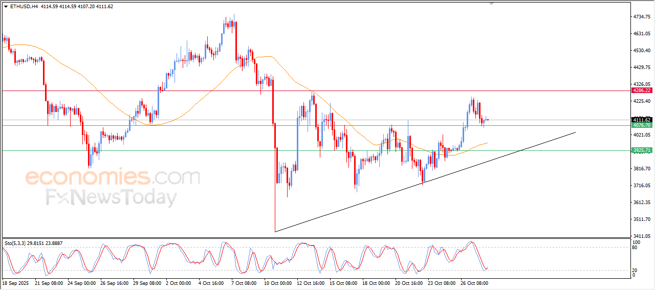 ارتفع سعر الإيثيريوم (ETHUSD) على استحياء خلال تداولاته اللحظية الأخيرة، وذلك على اثر ثبات مستوى الدعم 4,075$، ما أكسبه بعضاً من الزخم الإيجابي خاصة وقد جاء ذلك مع بدء تكوين دايفرجنس إيجابي بمؤشرات القوة النسبية، عقب وصولها لمناطق شديدة التشبع بعمليات البيع، بصورة مبالغ فيها مقارنة بحركة السعر، مع بدء ظهور تقاطع إيجابي بها، في ظل سيطرة الاتجاه التصحيحي الصاعد على المدى القصير، مع استمرار الدعم الديناميكي الناتج من تداولاته أعلى متوسطه المتحرك البسيط لفترة 50، ما يعزز من فرص تعافي السعر على المدى القريب.