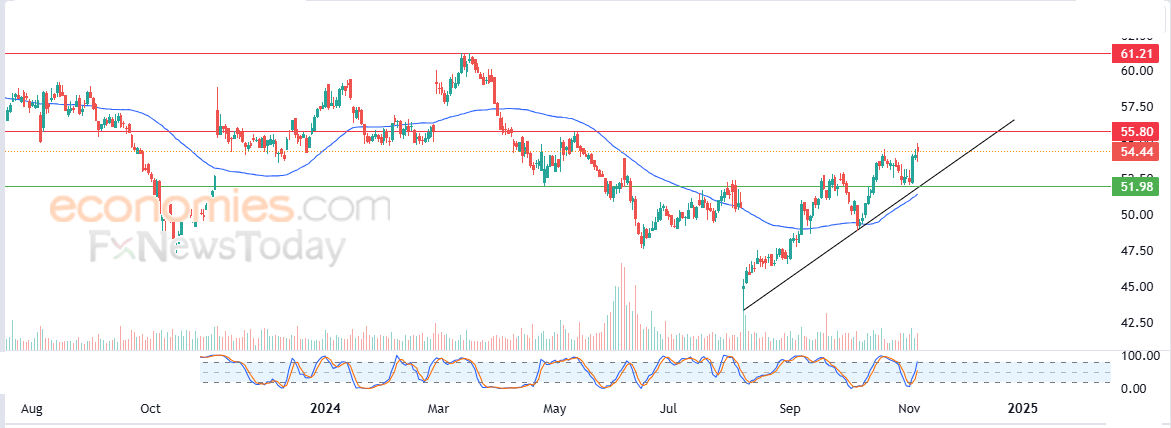 لذلك نحن نتوقع المزيد من الصعود لسعر السهم خلال تداولاته القادمة، خاصة في حالة اختراقه لمستوى المقاومة 55.80$، ليستهدف بعدها مستوى المقاومة المحوري 61.20$.