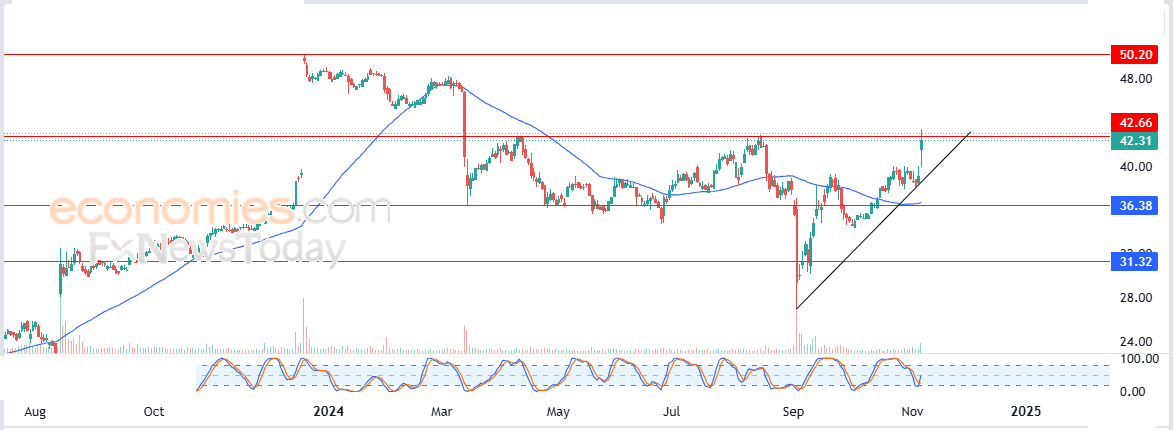 لذلك فتوقعاتنا تشير إلى المزيد من الصعود لسعر السهم خلال تداولاته القادمة، خاصة في حالة اختراقه لمستوى المقاومة 42.66، ليستهدف بعدها مستوى المقاومة المحوري 50.20$.