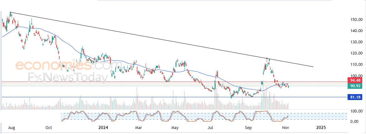 لذلك نحن نتوقع المزيد من الهبوط لسعر السهم خلال تداولاته القادمة، طيلة استقراره دون مستوى المقاومة 94.50$، ليستهدف مستوى الدعم المحوري 81.20$.