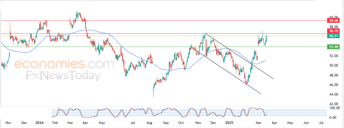 لذلك نحن نتوقع المزيد من الصعود لسعر السهم خلال تداولاته القادمة، خاصة في حالة اختراقه للمقاومة سابقة الذكر 56.70$، ليستهدف بعدها مستوى المقاومة 59.40$.