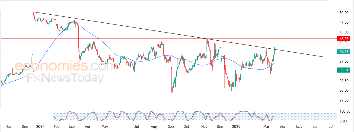 لذلك فتوقعاتنا ترجح عودة انخفاض سعر السهم خلال تداولاته القادمة، طيلة ثبات مستوى المقاومة 43.35$، ليستهدف مستوى الدعم 35.30$.