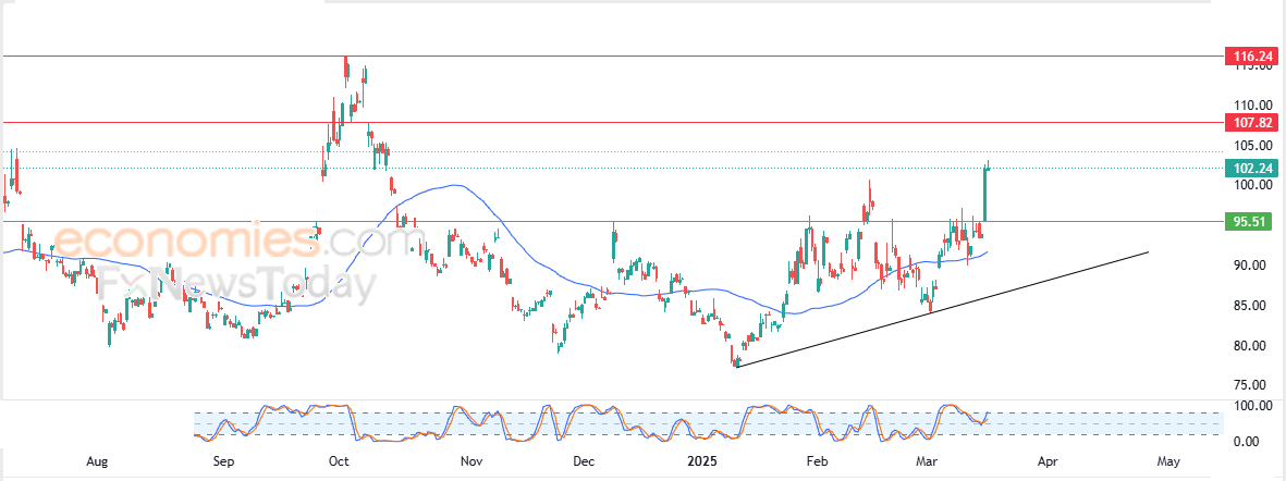 لذلك نحن نتوقع المزيد من الصعود لسعر السهم خلال تداولاته القادمة، طيلة ثبات مستوى الدعم 94.50$، ليستهدف أولى مستويات المقاومة عند سعر 107.80$.