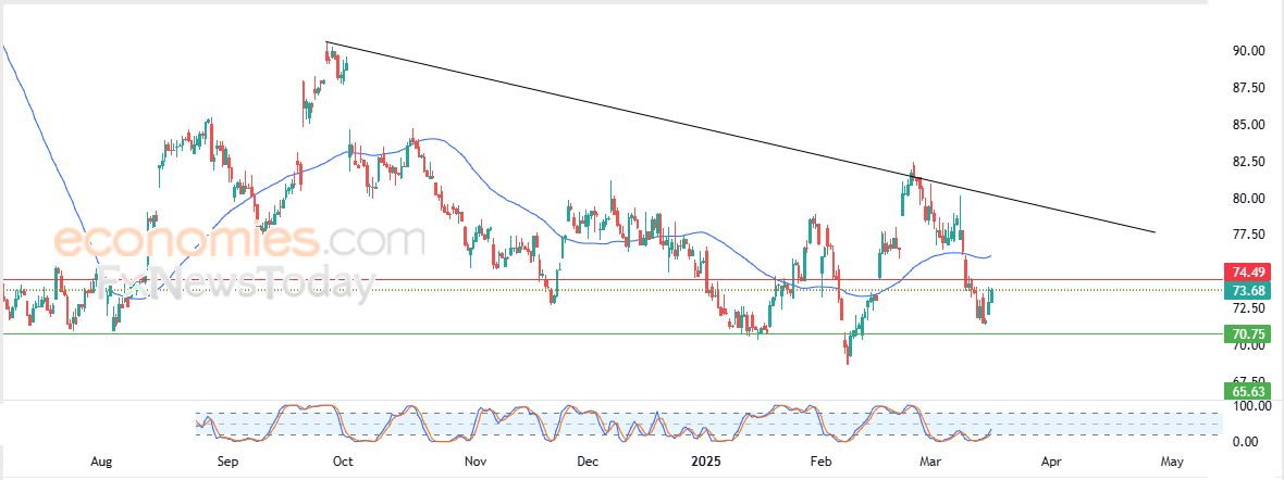 لهذا فتوقعاتنا ترجح عودة انخفاض سعر السهم خلال تداولاته القادمة، خاصة طيلة استقراره دون سعر 74.50$، ليستهدف مستوى الدعم المحوري 70.75$.