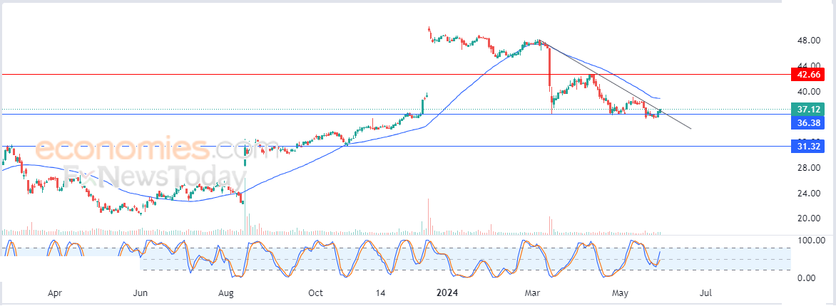 لذلك فتوقعاتنا ترجح عودة هبوط سعر السهم خلال تداولاته القادمة، خاصة في حالة كسره لمستوى الدعم 36.38$، ليستهدف بعدها مستوى الدعم 31.32$.