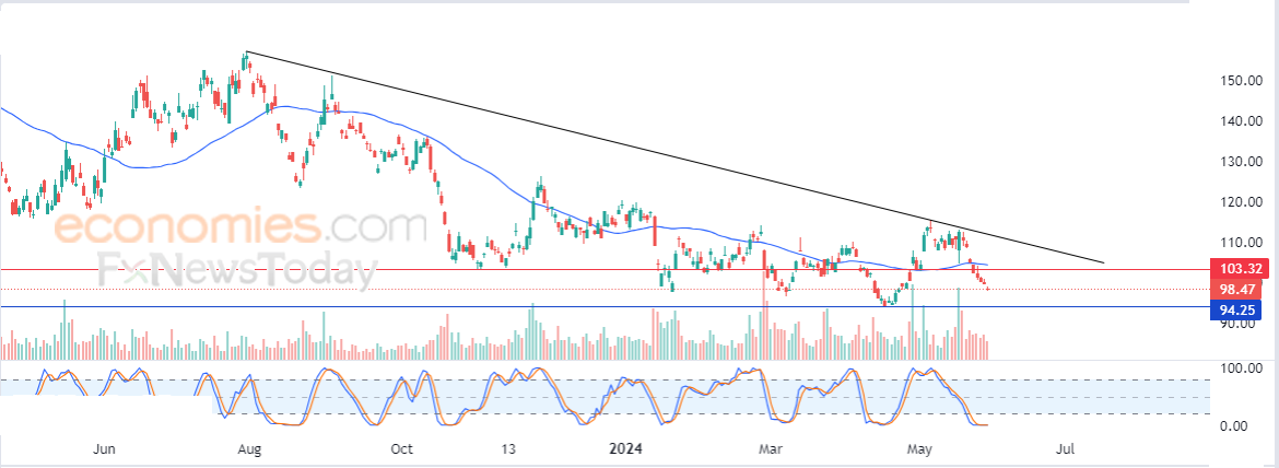 لذلك فتوقعاتنا تشير إلى استمرار هبوط سعر السهم خلال تداولاته القادمة، طيلة استقراره دون مستوى 103.30$، ليستهدف مستوى الدعم المحوري 94.25$.