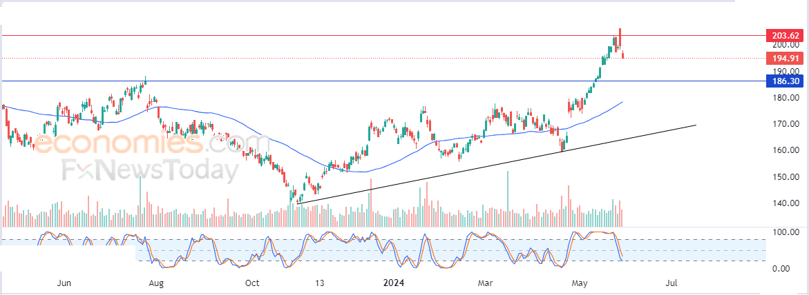 لذلك نحن نرجح عودة صعود سعر السهم خلال تداولاته القادمة، بشرط ثبات مستوى الدعم 186.30$، ليستهدف من جديد مستوى المقاومة 203.65$ استعداداً لمهاجمته.