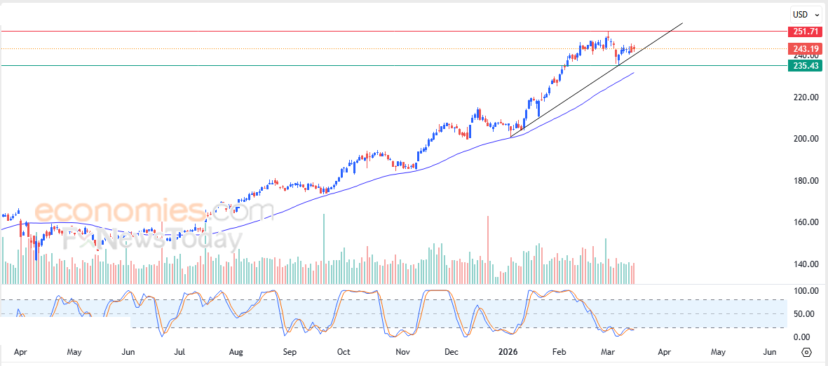 لذلك تشير توقعاتنا إلى صعود سعر السهم خلال تداولاته القادمة، طيلة ثبات مستوى الدعم 235.45$، ليستهدف مستوى المقاومة المحوري 251.70$.