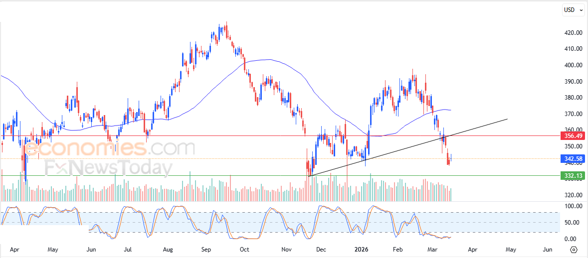 لهذا فتوقعاتنا تشير إلى هبوط سعر السهم خلال تداولاته القادمة، طيلة ثبات مستوى المقاومة 356.50$، ليستهدف مستوى الدعم المحوري 332.00$.