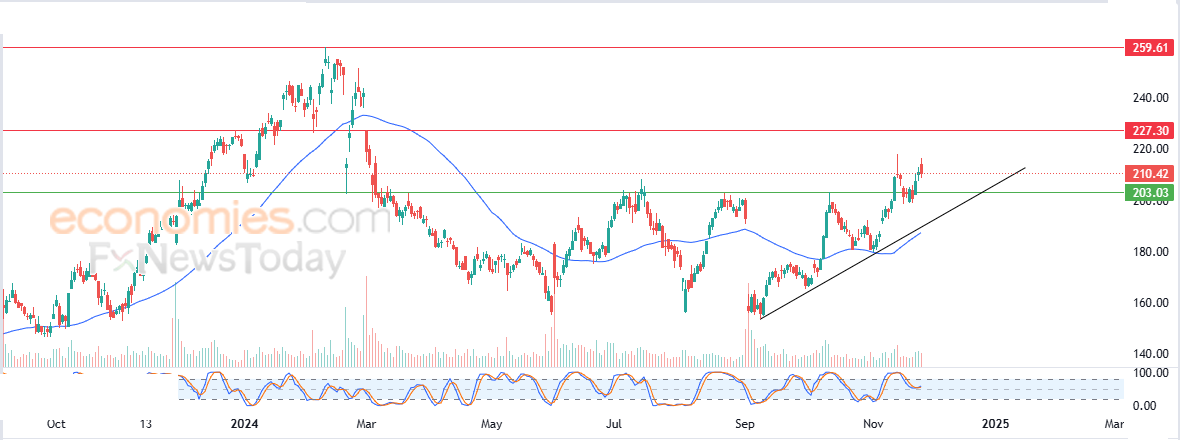 لذلك نحن نرجح عودة صعود سعر السهم خلال تداولاته القادمة، طيلة استقراره اعلى مستوى 203.00$، ليستهدف اولى مستويات المقاومة عند سعر 227.30$.