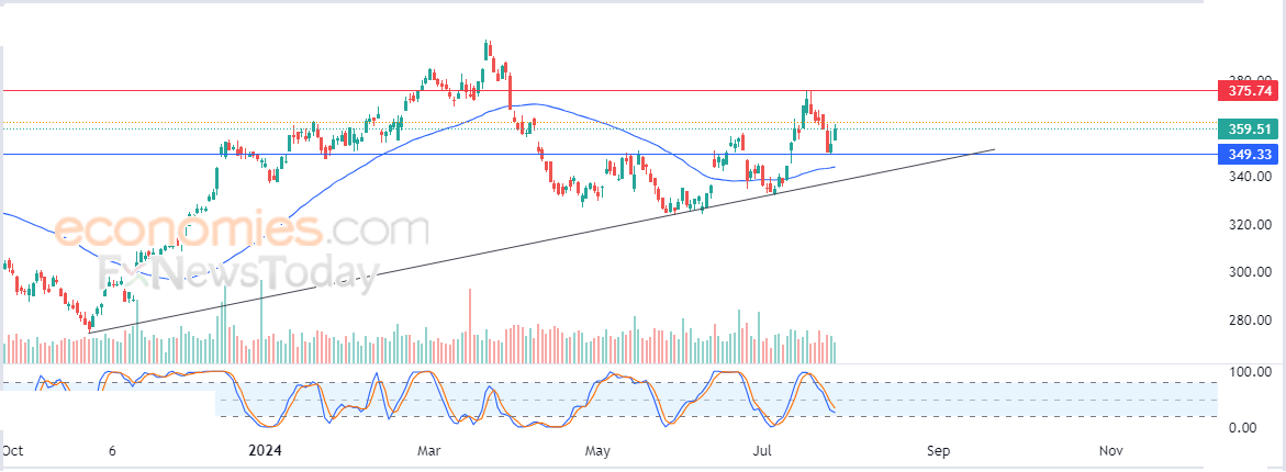 لهذا تشير توقعاتنا إلى المزيد من الصعود لسعر السهم خلال تداولاته القادمة، طيلة ثبات مستوى الدعم 349.33$، ليستهدف مستوى المقاومة 375.75$.