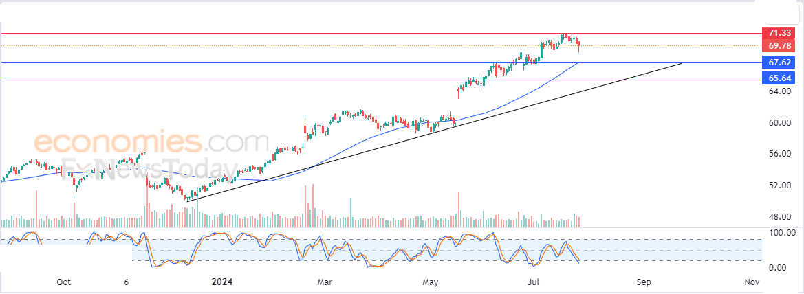 لهذا فتوقعاتنا ترجح عودة صعود سعر السهم خلال تداولاته القادمة، طيلة ثبات مستوى الدعم 67.60$، ليستهدف من جديد مستوى المقاومة 71.30$.