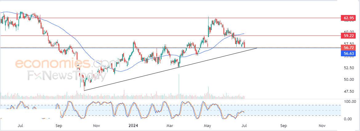 لذلك تشير توقعاتنا إلى ترجيح سيناريو عودة صعود سعر السهم خلال تداولاته القادمة، بشرط ثبات مستوى الدعم 56.72$، ليستهدف أولى مستويات المقاومة عند سعر 59.22$.