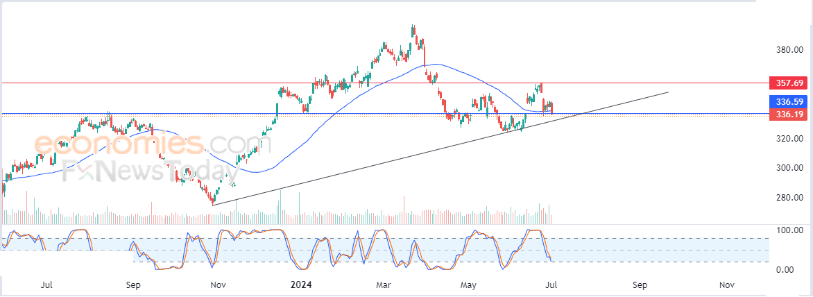 لذلك فتوقعاتنا ترجح عودة صعود سعر السهم خلال تداولاته القادمة، بشرط ثبات مستوى الدعم الحالي 336.60$، ليستهدف مستوى المقاومة 357.70$.