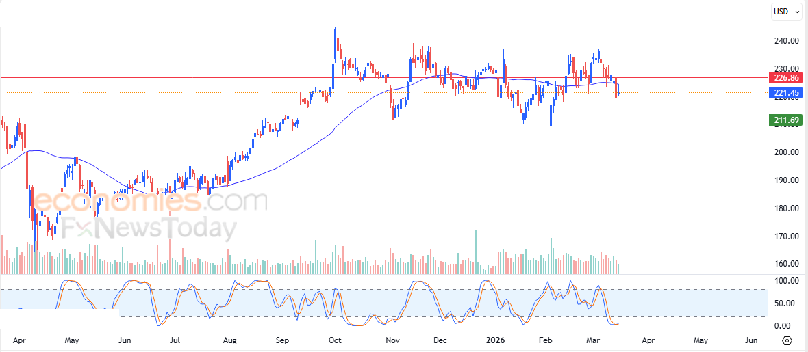 لهذا تشير توقعاتنا إلى انخفاض سعر السهم خلال تداولاته القادمة، طيلة استقراره دون مستوى المقاومة 226.85$، ليستهدف مستوى الدعم المحوري 211.70$.
