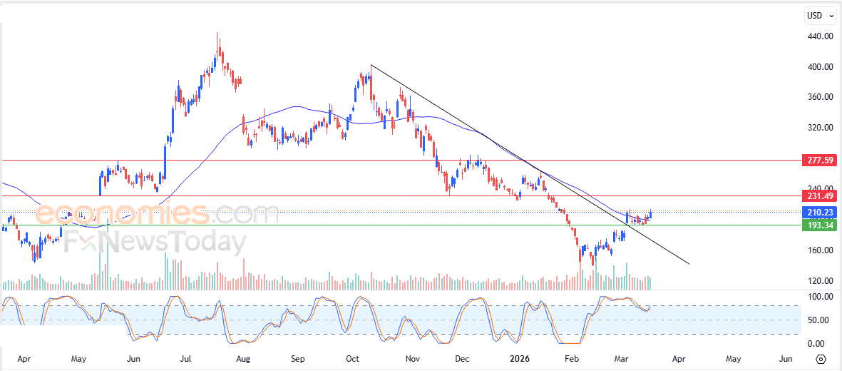 لذلك فتوقعاتنا تشير إلى صعود سعر السهم خلال تداولاته اللحظية القادمة، طيلة استقراره اعلى الدعم 193.35$، ليستهدف أولى مستويات المقاومة عند سعر 231.50$.