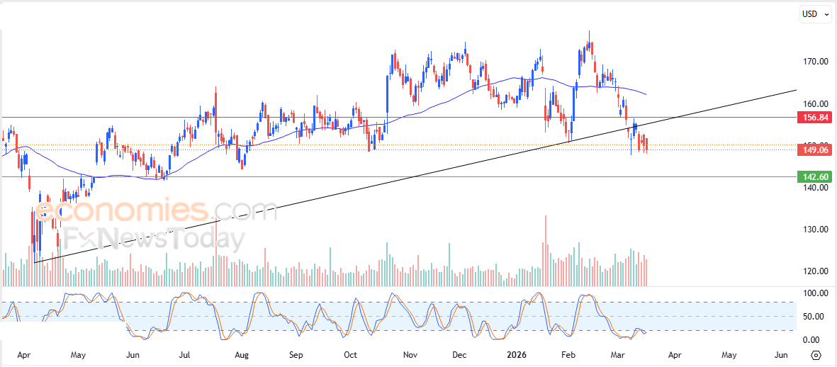 لهذا فتوقعاتنا تشير إلى هبوط سعر السهم خلال تداولاته القادمة، طيلة ثبات مستوى المقاومة 156.85$، ليستهدف مستوى الدعم 142.60$.