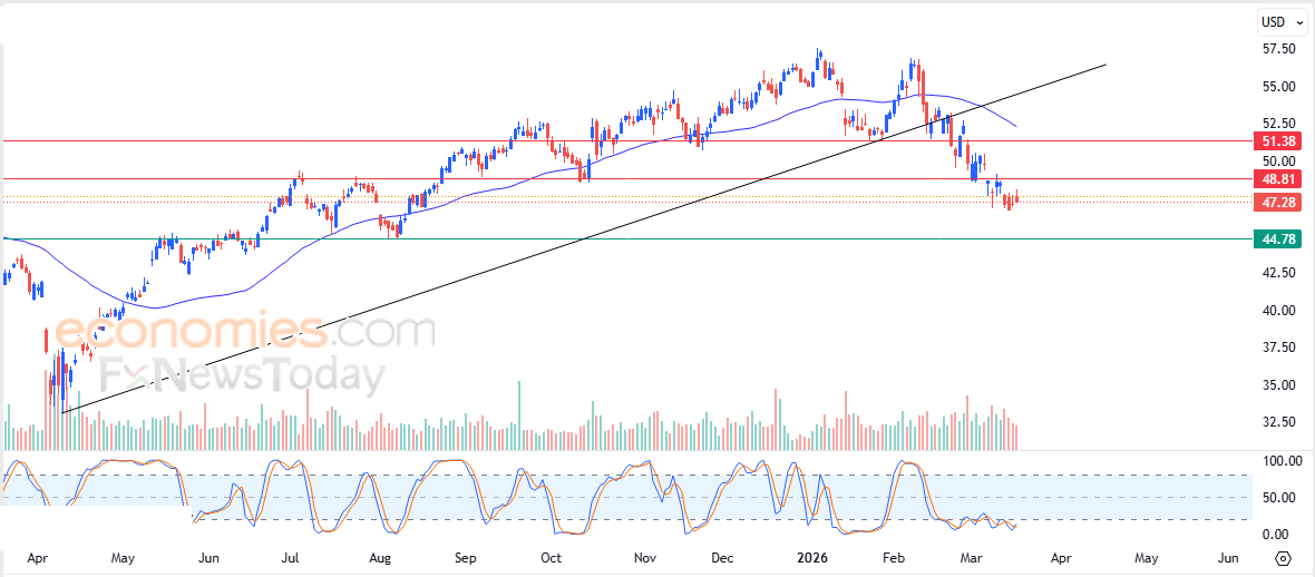 لذلك تشير توقعاتنا إلى انخفاض سعر السهم خلال تداولاته القادمة، خاصة طيلة استقراره دون المقاومة 48.80$، ليستهدف مستوى الدعم 44.80$.