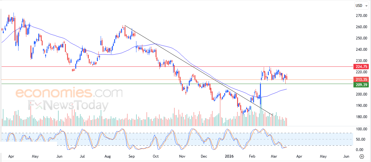 لهذا تشير توقعاتنا إلى صعود سعر السهم خلال تداولاته القادمة، طيلة ثبات مستوى الدعم 209.40$، ليستهدف مستوى المقاومة المحوري 224.75 استعداداً لمهاجمته.