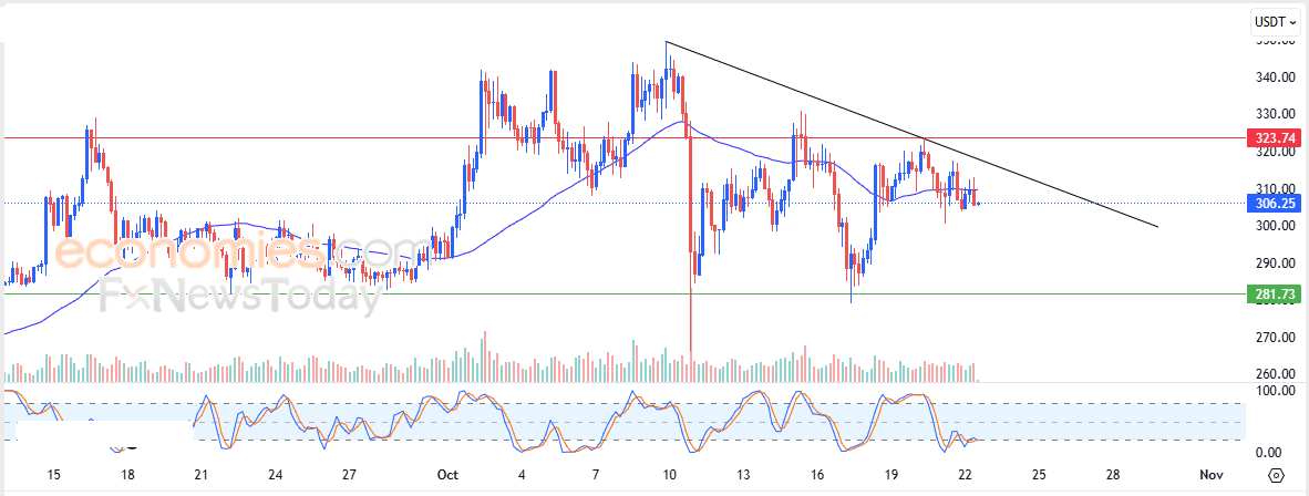 لهذا تشير توقعاتنا إلى انخفاض سعر العملة خلال تداولاته اللحظية القادمة، طيلة ثبات مستوى المقاومة 323.75$، ليستهدف مستوى الدعم المحوري 281.75$.