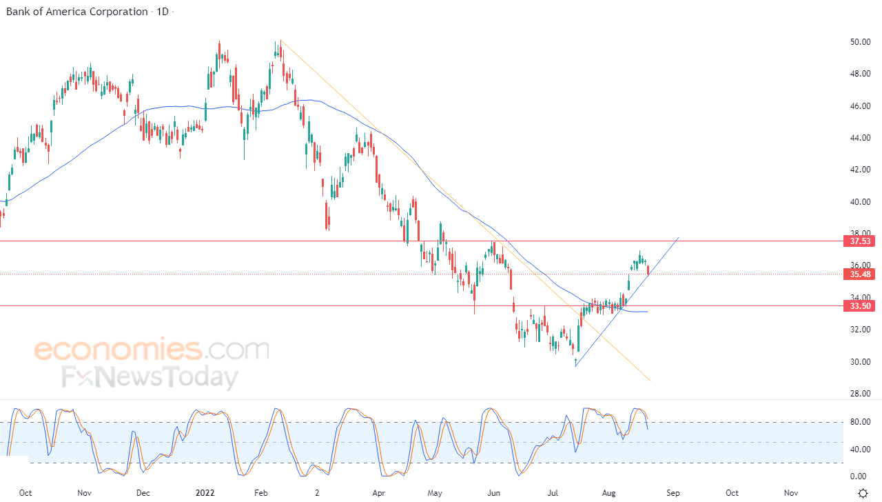 انخفض سهم بنك أوف أمريكا (BAC) في آخر جلساته، ليجني السهم أرباح ارتفاعاته الأخيرة، وليحاول اكتساب زخماً إيجابياً قد يساعده على التعافي والارتفاع من جديد، كما يحاول في الوقت نفسه تصريف البعض من تشبعه الشرائي الواضح بمؤشرات القوة النسبية، خاصة مع بدء توارد الإشارات السلبية منها، ليسجل خسائر بنسبة بلغت -2.21% بما يعادل 80 سنت وليستقر في نهاية التداولات على سعر 35.48 دولار، في ظل سيطرة موجة تصحيحية صاعدة على المدى القصير، وبدعم إيجابي متواصل لتداولاته اعلى متوسطه المتحرك البسيط لفترة 50 يوماً السابقة.