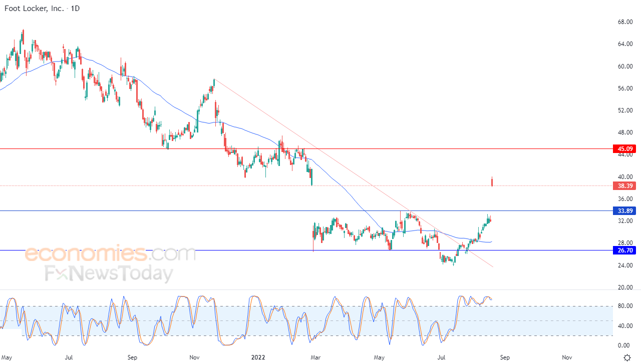 صعد سهم فوت لوكر FOOT LOCKER (FL) بشكل حاد بتداولاته الأخيرة على المستويات اللحظية، بعد أن تجاوزت الشركة توقعات الأرباح وعينت رئيسًا تنفيذيًا جديدًا، ليحقق مكاسب حادة في آخر جلساته بنسبة بلغت 20.04% بما يعادل 6.41 نقطة ليستقر في نهاية التداولات على سعر 38.39 دولار، بحجم تداولات تجاوز 26.6 مليون سهم مقابل متوسط أحجام التداول لعشر جلسات سابقة والذي يتجاوز 4.6 مليون سهم.
