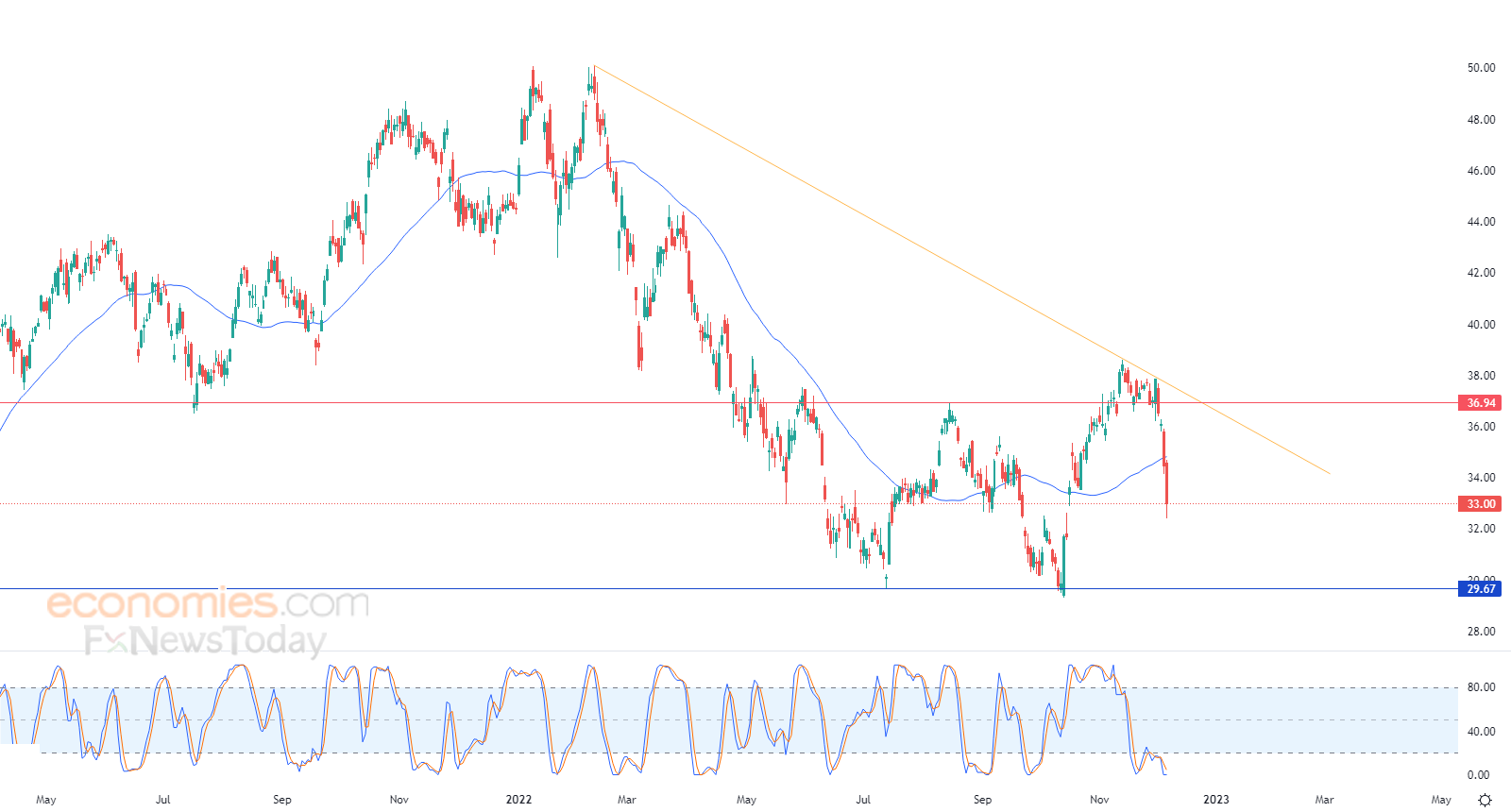 لهذا نحن نتوقع المزيد من الانخفاض للسهم خلال تداولاته القادمة، طيلة ثبات المقاومة 36.95، ليستهدف مستوى الدعم المحوري 29.67.