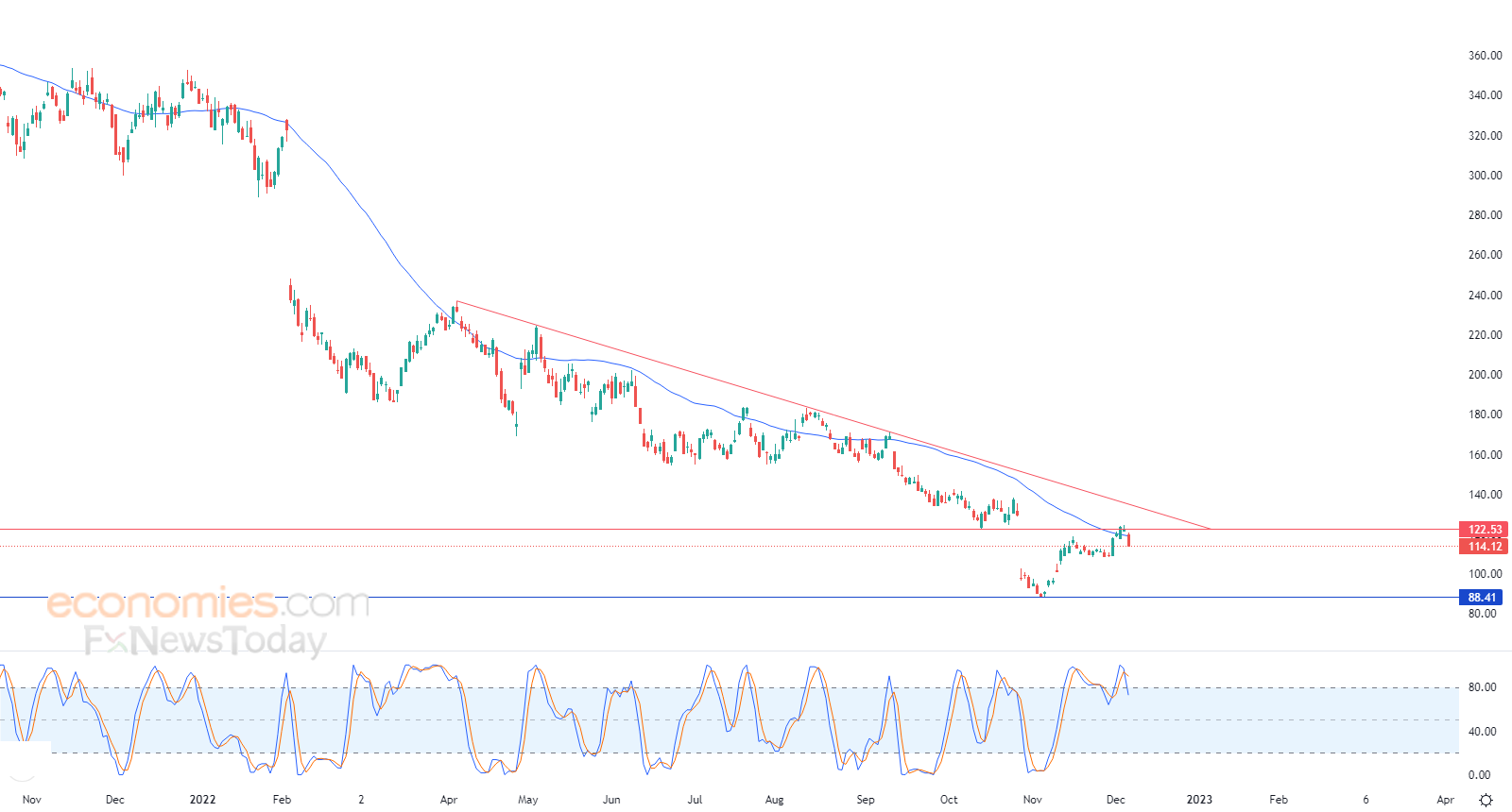 لهذا تشير توقعاتنا إلى المزيد من الانخفاض للسهم خلال تداولاته القادمة، ليستهدف مستوى الدعم 88.41، طيلة ثبات المقاومة 122.53.