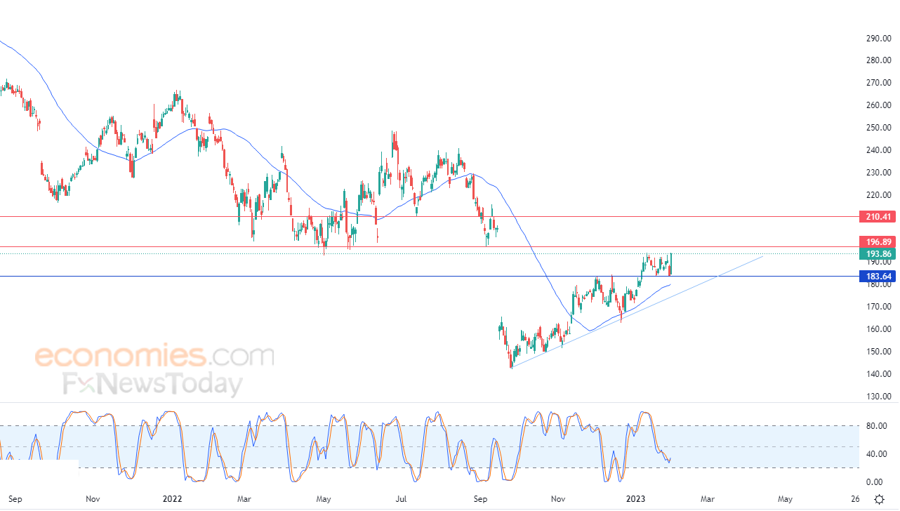 لذلك نحن نتوقع المزيد من الارتفاع التصحيحي للسهم خلال تداولاته القادمة، خاصة في حالة اختراقه للمقاومة 196.90، ليستهدف بعدها مباشرة أولى مستويات المقاومة عند سعر 210.40.