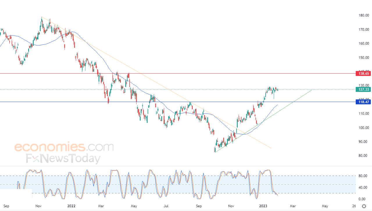 لهذا نحن نتوقع ارتفاع السهم خلال تداولاته القادمة، طيلة ثبات الدعم 118.50، ليستهدف مستوى المقاومة 138.65.
