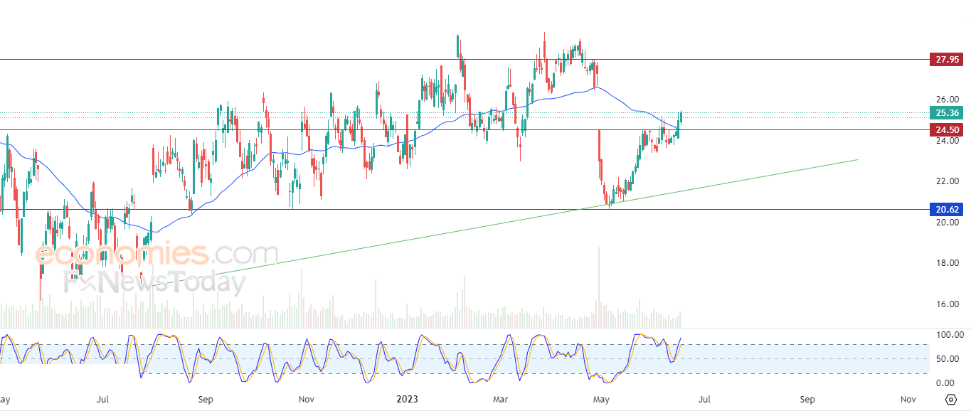 لذلك تشير توقعاتنا إلى المزيد من الصعود للسهم خلال تداولاته القادمة، خاصة طوال استقراره فوق مستوى 24.50، ليستهدف مستوى المقاومة 28.00.