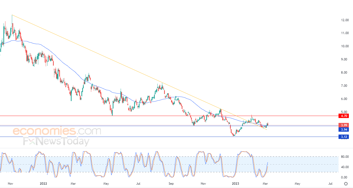 لذلك تشير توقعاتنا إلى ترجيح سيناريو عودة ارتفاع السهم خلال تداولاته القادمة، طيلة استقراره فوق مستوى 3.94، ليستهدف مستوى المقاومة 4.70.