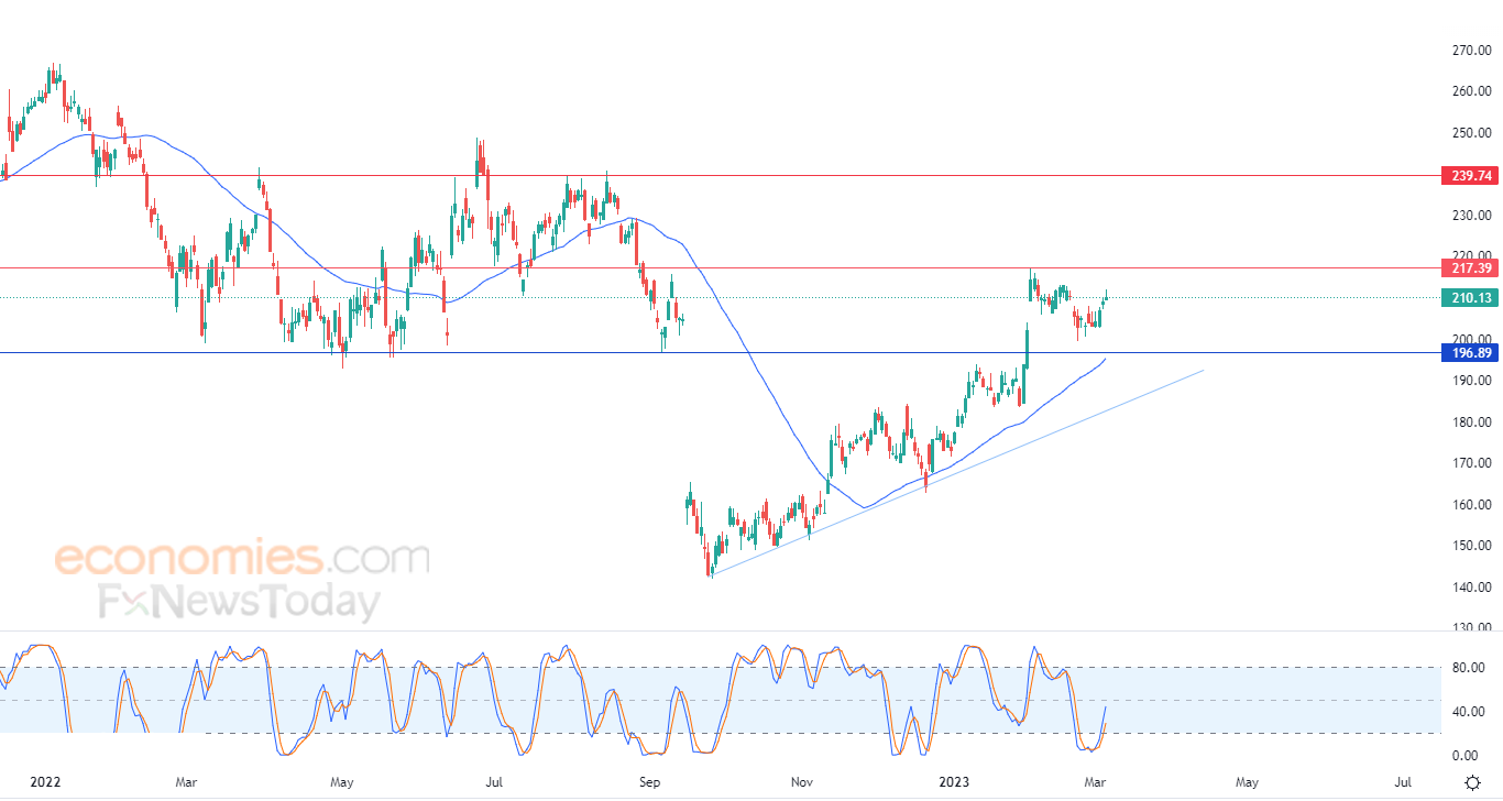 ولهذا فتوقعاتنا تشير إلى المزيد من الصعود للسهم خلال تداولاته القادمة، طيلة ثبات الدعم 196.90، ليستهدف مستوى المقاومة المهم 217.40 استعداداً لمهاجمته.