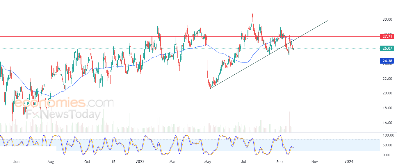 لذلك تشير توقعاتنا إلى ترجيح سيناريو عودة انخفاض السهم خلال تداولاته القادمة، طيلة ثبات المقاومة 27.70، ليستهدف مستوى الدعم 24.40.