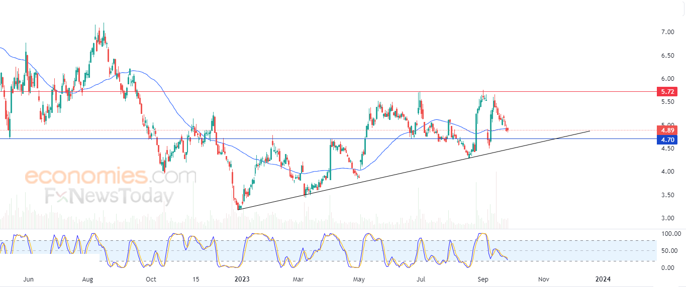 لذلك تشير توقعاتنا إلى ارتفاع السهم خلال تداولاته القادمة، طيلة ثبات الدعم 4.70، ليستهدف مستوى المقاومة المحوري 5.70.