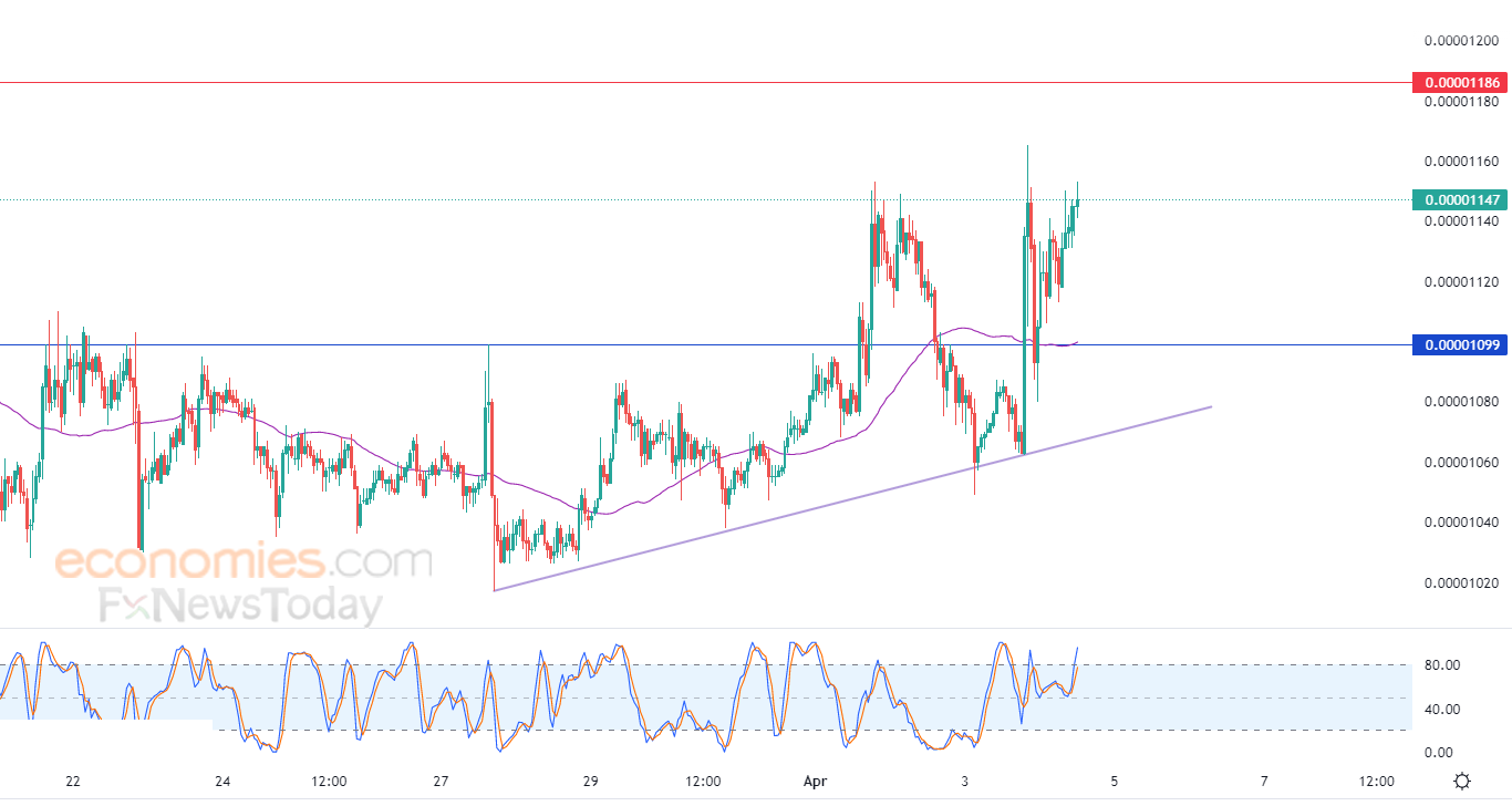 لهذا تشير توقعاتنا إلى المزيد من الصعود للزوج خلال تداولاته القادمة، طيلة ثبات الدعم 0.00001099، ليستهدف مستوى المقاومة المحوري 0.00001186.
