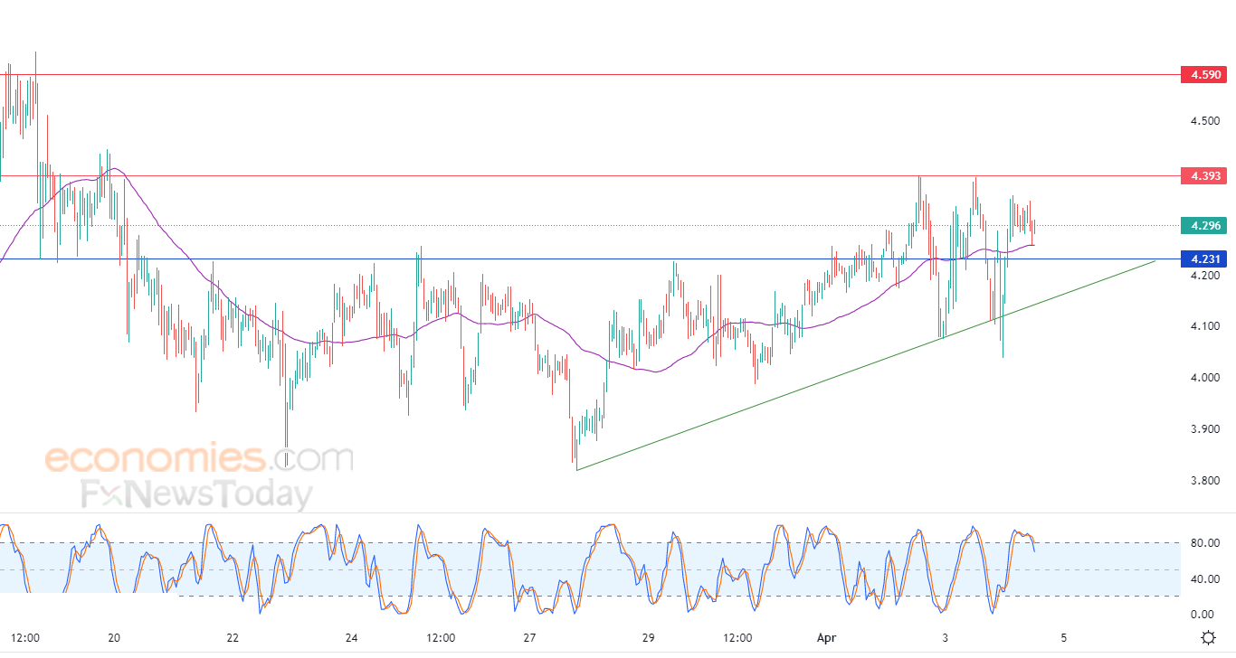 لهذا نحن نرجح ارتفاع الزوج خلال تداولاته القادمة، خاصة في حالة اختراقه للمقاومة 4.393، ليستهدف بعدها مستوى المقاومة 4.590.
