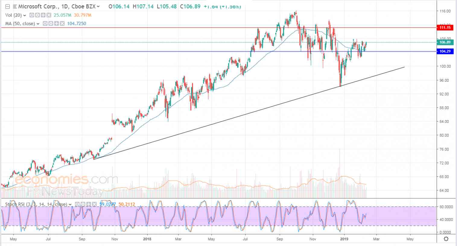 ارتفع السهم في آخر جلساته ، ليحقق أرباحاً بلغت نسبتها 1.56% بما يعادل 1.64 نقطة ، ويأتي هذا الارتفاع في ظل سيطرة تامة للاتجاه الرئيسي الصاعد على المدى المتوسط والقصير ، مع الدعم الإيجابي للمتوسط المتحرك البسيط لفترة 50 يوماً السابقة ، وتوارد الإشارات الإيجابية بمؤشرات القوة النسبية .