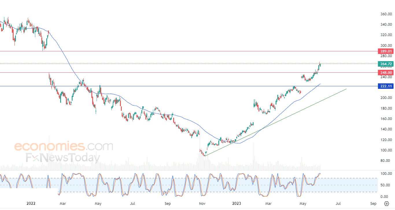لهذا نحن نتوقع المزيد من الصعود للسهم خلال تداولاته القادمة، طيلة استقراره فوق مستوى 248.00، ليستهدف مستوى المقاومة 289.00.