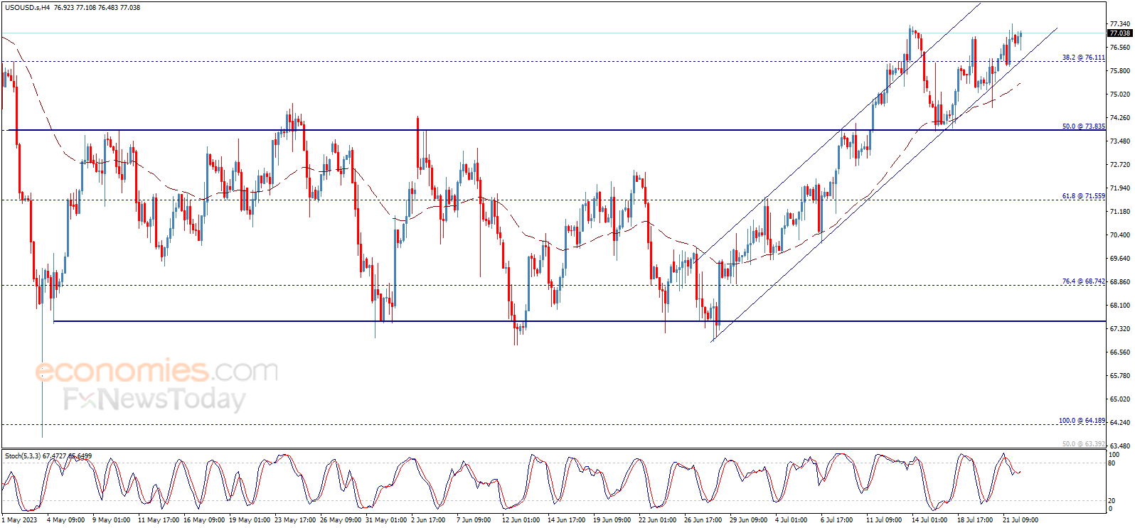 يزحف سعر النفط نحو الأعلى ليتحرّك فوق حاجز 77.00، ليدعم استمرار الاتجاه الصاعد المتوقع لهذا اليوم، والذي يستهدف مستويات 78.00 ثم 78.90 كمحطات رئيسية تالية.