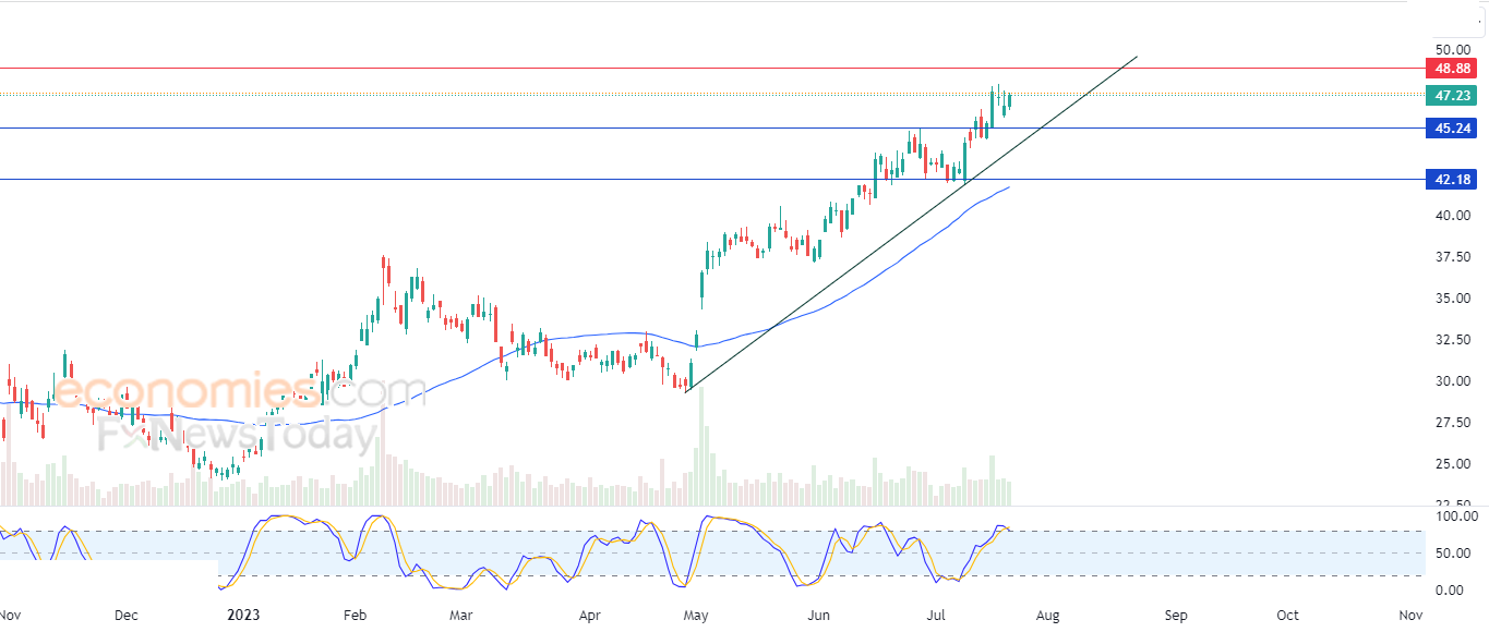 لذلك تشير توقعاتنا إلى المزيد من الصعود للسهم خلال تداولاته القادمة، طيلة استقراره فوق مستوى 45.24، ليستهدف أولى مستويات المقاومة عند 48.88.