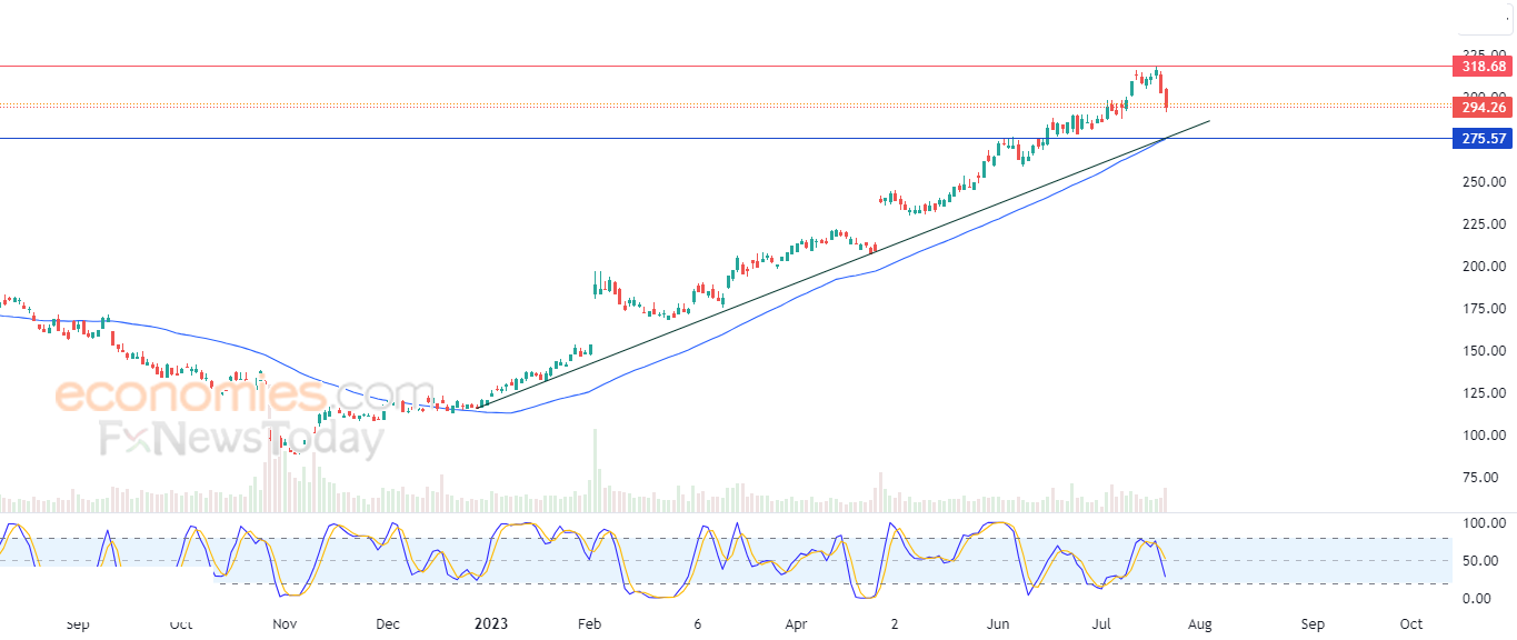 لهذا نحن نرجح عودة ارتفاع السهم خلال تداولاته القادمة، طيلة ثبات الدعم 275.57، ليستهدف من جديد مستوى المقاومة 318.68 استعداداً لمهاجمته.