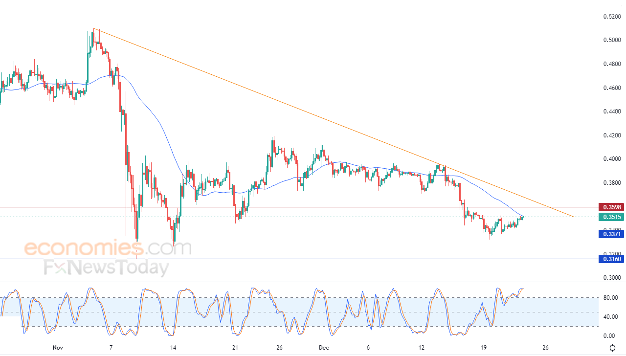 لهذا تشير توقعاتنا إلى المزيد من الصعود للزوج خلال تداولاته القادمة، طيلة ثبات الدعم 0.322، ليستهدف مستوى المقاومة المحوري والقريب 0.410 استعداداً لمهاجمته.